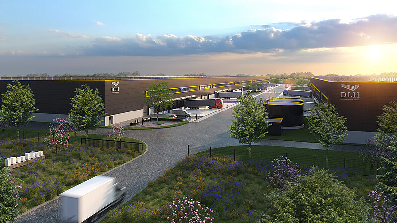 Der Campus wird über alle Anforderungen einer modernen und nachhaltigen Logistikimmobilie verfügen. Der Neubau entsteht nach DGNB-GOLD-Standards und unter Berücksichtigung einer naturnahen Außengestaltung, die die Biodiversität fördert und dem sozialen Anspruch gerecht wird. Mit Grundrissen, die das Miteinander der Beschäftigten fördern und vergangene Barrieren zwischen Lager und Administrative aufbrechen.
